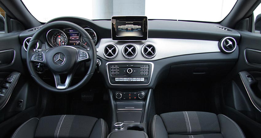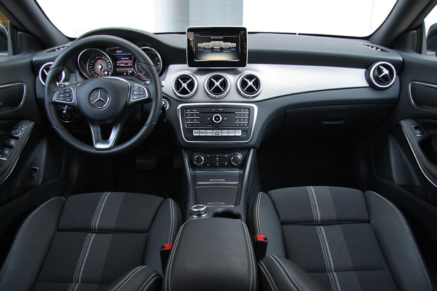 Στο εσωτερικό της CLA η Mercedes διαφοροποίησε ανεπαίσθητα θα λέγαμε την όλη εικόνα (νέες επενδύσεις και χρωματισμοί με περισσότερο χρώμιο σε διακόπτες και χειριστήρια), διατηρώντας έναν από τους πιο στιλάτους θαλάμους της κατηγορίας. Από εκεί και πέρα, γνωρίσματα του εσωτερικού παραμένουν οι 5 στρογγυλοί αεραγωγοί με τις λεπτές γρίλιες πάνω στο ταμπλό, η ψηφιακή οθόνη για το σύστημα πολυμέσων ψηλά στην κονσόλα, αλλά και τα σπορ εμπρόσθια καθίσματα με τα σταθερά προσκέφαλα. Στον τομέα της ποιότητας, το μαλακό πλαστικό πάνω στο ταμπλό και το εσωτερικό των θυρών τονίζει τον ποιοτικό χαρακτήρα της CLA, ενώ το φινίρισμα και η συναρμογή των υπολοίπων σκληρών πλαστικών βρίσκεται σε υψηλά επίπεδα. Στους χώρους, λόγω της σχεδίασης του αμαξώματος και του κουπέ τελειώματος της οροφής, θα απαιτηθούν παραχωρήσεις ως προς το χώρο για τα κεφάλια των πίσω επιβατών. Από την άλλη βέβαια, ο χώρος για τα γόνατα και τους ώμους τους είναι υπέρ-αρκετός. Σε πολύ καλά επίπεδα παραμένει η χωρητικότητα του πορτ-μπαγκάζ των 470 λίτρων.