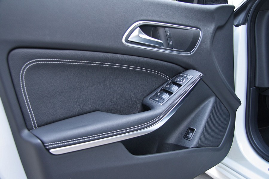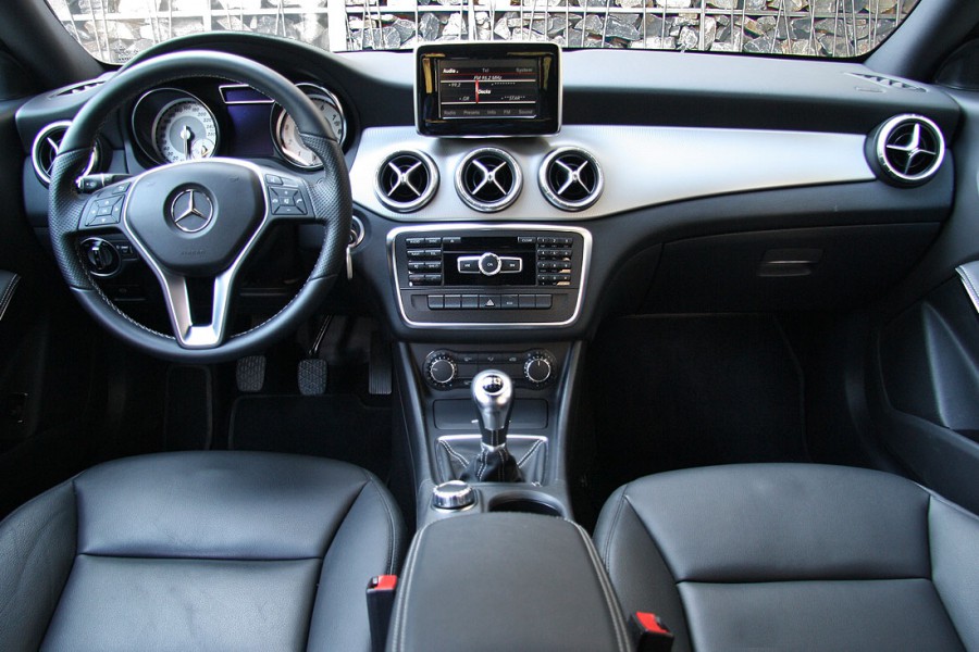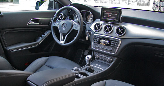 Το εσωτερικό της CLA είναι σχεδόν ίδιο με το αντίστοιχο της A-Class και η μόνη σχεδιαστική διαφορά εντοπίζεται στην προσθήκη διακοσμητικής επένδυσης στο ταμπλό. Το τελευταίο στο πάνω τμήμα του είναι κατασκευασμένο από μαλακό πλαστικό, υλικό που συναντάται και στις πόρτες. Τα σκληρά πλαστικά, η συναρμογή και το φινίρισμα είναι μεν καλά αλλά όχι στα υψηλά επίπεδα που μας έχει «συνηθίσει» η Mercedes. Επίσης η εργονομία χρειάζεται εξοικείωση, ωστόσο πιο σημαντικό μειονέκτημα αποτελεί η ορατότητα ειδικά προς τα πίσω που είναι πολύ περιορισμένη και καθιστά αναγκαία λύση την τοποθέτηση αισθητήρων παρκαρίσματος.