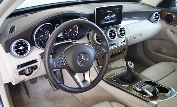 Το εσωτερικό της νέας C-Class είναι όμορφο σχεδιαστικά και διακρίνεται για την υψηλή ποιότητα κατασκευής, το κορυφαίο φινίρισμα αλλά και την πολυτέλεια και την τεχνολογία που αποτελούν ωστόσο κομμάτια του προαιρετικού εξοπλισμού της. Το ταμπλό είναι μικρό σε όγκο και ενσωματώνει την μεγάλη οθόνη σε στυλ tablet στο πάνω μέρος του με εκείνη άλλη μια φορά -και παρά τις αρνητικές κριτικές που δέχτηκε η A-Class για τον ίδιο λόγο- δείχνει σαν να προστέθηκε τελευταία στιγμή στο εσωτερικό της. Κατά τα άλλα η σχεδίαση είναι όμορφη και καταφέρνει να συνδυάζει την πολυτέλεια με νεανικό ύφος (όχι όμως στην έκδοση της δοκιμής με τις ξύλινες επενδύσεις). Το touch pad ανάμεσα στα δύο εμπρόσθια καθίσματα είναι εξαιρετικό στην χρήση του και μέσω εκείνου ελέγχονται όλες οι παράμετροι του συστήματος πολυμέσων COMAND που αναπαρίστανται στην μεγάλη οθόνη, ενώ παρά τον αρκετό χρόνο εκμάθησης που απαιτεί, μετά δεν ενοχλεί με την εργονομία του. Οι χώροι βελτιώθηκαν σε σχέση με την προγενέστερη γενιά, με τους επιβάτες να έχουν μεγαλύτερο χώρο για τα πόδια και μεγαλύτερο εσωτερικό πλάτος, ωστόσο ο μεσαίος επιβάτης στο πίσω κάθισμα δεν θα νιώσει άνετα αφού και εκείνο δεν είναι σχεδιασμένο για κάτι τέτοιο αλλά και επειδή το μεγάλο τούνελ της μετάδοσης που βρίσκεται στο κέντρο, περιορίζει το διαθέσιμο χώρο για τα πόδια του. Ο χώρος αποσκευών έχει όγκο 480 λίτρων και είναι μόλις κατά 5 λίτρα μεγαλύτερος από την προγενέστερη W204, με το σχήμα και το βάθος του όμως να ικανοποιούν.