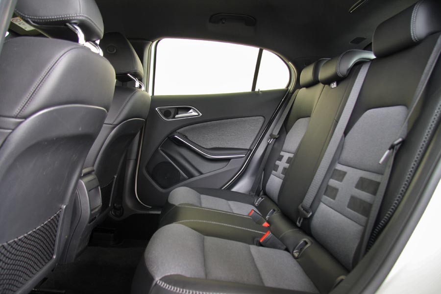Το εσωτερικό της GLA προέρχεται αυτούσιο από την CLA (δοκιμή CLA 180), ενώ οι ικανοποιητικοί χώροι για τέσσερις επιβάτες είναι ακριβώς ίδιοι με της A-Class (σύμφωνα με τις μετρήσεις της Mercedes). Η ουσιαστική διαφορά εντοπίζεται το πίσω άκρο, όπου ο μεγαλύτερος πρόβολος από εκείνον της μικρομεσαίας 5θυρης Mercedes έχει αυξήσει την χωρητικότητα του πορτμπαγκάζ στ 421 λίτρα. Από πλευράς ποιότητας, το πάνω τμήμα του ταμπλό είναι κατασκευασμένο από μαλακό πλαστικό, υλικό που συναντάται και στις πόρτες. Τα σκληρά πλαστικά στην κονσόλα, η συναρμογή και το φινίρισμα είναι μεν καλά αλλά όχι στα υψηλά επίπεδα που μας έχει «συνηθίσει» η Mercedes. Επίσης η εργονομία χρειάζεται εξοικείωση ειδικά όσον αφορά τον χειρισμό του περιστροφικού χειριστηρίου COMAND που βρίσκεται πίσω από τον επιλογέα των ταχυτήτων. Πολύ καλή είναι η θέση οδήγησης με τις πολλαπλές ρυθμίσεις καθίσματος – τιμονιού και της καλύτερης ορατότητας που εξασφαλίζει η μεγαλύτερη απόσταση του αμαξώματος από το έδαφος.