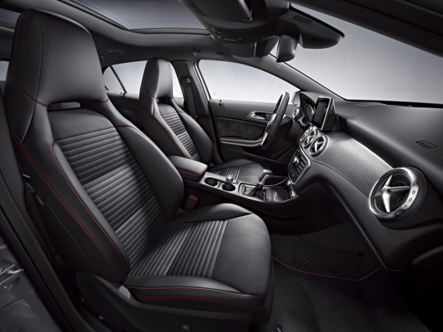 Στο εσωτερικό της Mercedes GLA AMG Line το δυναμικό χαρακτήρα τονίζουν τα σπορ καθίσματα με τις μαύρες δερμάτινες επενδύσεις και τις κόκκινες ραφές, η επένδυση αλουμινίου στο ταμπλό, οι νίκελ στρογγυλοί αεραγωγοί και το flat bottom τιμόνι. Οι πωλήσεις της GLA αναμένεται να ξεκινήσουν σύντομα, ενώ τον Ιανουάριο στην έκθεση αυτοκινήτου του Ντιτρόιτ θα γίνει η πρεμιέρα και της κορυφαίας GLA 45 AMG.