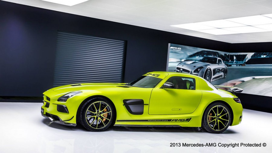 Κατά παραγγελία ενός «ειδικού πελάτη», το όνομα του οποίου δεν έχει δοθεί φυσικά στη δημοσιότητα, η εικονιζόμενη Mercedes SLS AMG Black Series είναι μια μοναδική δημιουργία του AMG Performance Studio. Το επίσημο βελτιωτικό τμήμα της AMG, το οποίο κατά παραγγελία του πελάτη εξατομικεύει την AMG του, έχει βάψει αυτή την SLS AMG Black Series σε ένα ειδικό κίτρινο χρώμα, που πρώτη φορά χρησιμοποιείται σε SLS, ενώ έχει προσθέσει στο αμάξωμα πλαϊνά γραφικά, μαύρα λογότυπα, ειδικής σχεδίασης ζάντες αλουμινίου, αλλά και περιμετρικά αεροδυναμικά βοηθήματα από ανθρακόνημα. Στο εσωτερικό της πανέμορφης αυτής Mercedes SLS AMG, ξεχωρίζουν τα δίχρωμα καθίσματα (μαύρο – κίτρινο) και ο αντίστοιχος χρωματισμός στο ταμπλό.