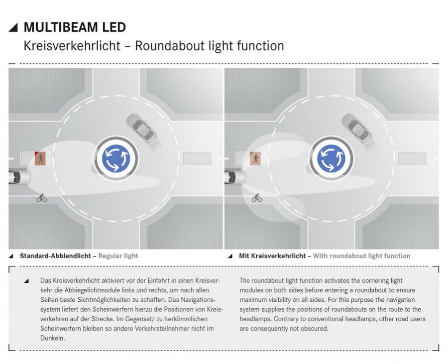 Η ενεργή λειτουργία φωτισμού επιτρέπει στον οδηγό να εντοπίσει πιθανούς κινδύνους κατά την είσοδο και έξοδο από τις στροφές, καθώς τα MULTIBEAM LED φώτα έχουν φωτίσει το δρόμο πριν ακόμα στρίψει το τιμόνι ή έρθει στην θέση της ευθείας. Επίσης, στους κυκλικούς κόμβους έχει ενεργοποιηθεί η λειτουργία φωτισμού στροφών προς τα αριστερά και δεξιά πριν από την είσοδο στην «πλατεία» για να εξασφαλιστεί η μέγιστη δυνατή ορατότητα.