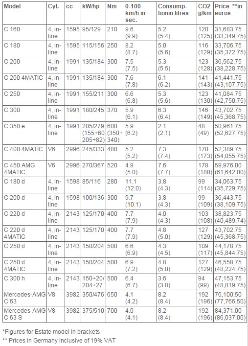 Νέες στην γκάμα της C-Class είναι η τετρακίνητες C 200 4MATIC με 2λιτρο κινητήρα των 184 ίππων και η C 220d 4MATIC με το ντίζελ των 2.1 λτ. ισχύος 170 ίππων. Νέα είναι και η C 300 με 2.0 λτ. μηχανικό σύνολο 245 ίππων, το οποίο προσφέρει επιτάχυνση στα 0-100 χλμ./ώρα σε 5,9 δευτερόλεπτα. Περισσότερο ισχυρή είναι η έκδοση C 450 AMG 4MATIC με τον V6 κινητήρα των 3.0 λτ. ισχύος 367 ίππων και 520 Nm ροπής, με 0-100 χλμ./ώρα σε 4,9 δλ.
