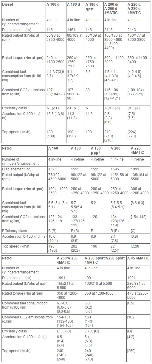 Από πλευράς εκδόσεων και κινητήρων (βλ. παρακάτω τους αναλυτικούς πίνακες), αρχική είναι η A 160 των 102 ίππων, ενώ στους ντίζελ η A 180 d BlueEFFICIENCY των 109 ίππων καταναλώνει μόλις 3,5 λτ./100 χλμ. πετρέλαιο και εκπέμπει 89 γρ./χλμ. CO2. Νέες είναι οι εκδόσεις με χειροκίνητο κιβώτιο ταχυτήτων στις A 250 και Α 250 Sport. H A 220 είναι ισχυρότερη κατά 7 ίππους (177hp), ενώ οι σπορ εκδόσεις A 250 Sport και A 250 Sport 4MATIC τώρα αποδίδουν 218 ίππους αντί 211 ίππους. Ακόμα υψηλότερη ισχύ αποδίδει και η κορυφαία Mercedes-AMG A 45 4MATIC. Ο πανίσχυρος 2λιτρος κινητήρας έφτασε τους 381 ίππους και 475 Nm ροπής (από 360 hp και 450 Nm), επιταχύνοντας το αυτοκίνητο στα 0-100 χλμ./ώρα σε 4,2 δευτερόλεπτα (0,4 δλ. πιο γρήγορη από πριν).