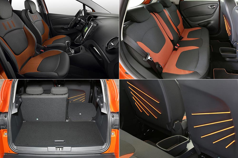 Όπως στο αμάξωμα, έτσι και στο εσωτερικό του Captur κυριαρχούν οι καμπύλες. Στο ταμπλό και σε επιμέρους επιφάνειες έχει γίνει ευρεία χρήση σκληρών πλαστικών και αυτό είναι κάτι που αρχικά μπορεί να ξενίσει. Χαρακτηριστικό που βελτιώθηκε στο ανανεωμένο μοντέλο το 2017 με την προσθήκη λεπτής μαλακής επένδυσης. Εκεί που δεν αφήνει κανένα παράπονο, είναι στους χώρους. Παρά τις κόμπακτ διαστάσεις του μπορεί εύκολα να εξυπηρετήσει τις ανάγκες μιας τετραμελούς οικογένειας. Την πρακτικότητα του εσωτερικού ενισχύουν οι διάφορες θήκες, το πολύ μεγάλο συρόμενο ντουλαπάκι συνοδηγού των 11,5 λίτρων και το συρόμενο πίσω κάθισμα. Η χωρητικότητα του πορτ μπαγκάζ διαμορφώνεται ανάλογα από 377 έως 455 λίτρα.