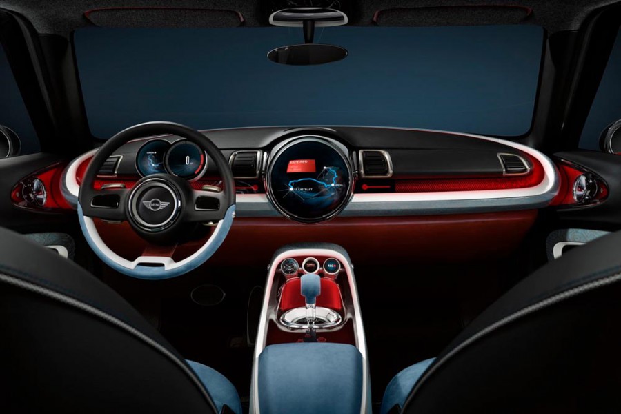 Ιδιαίτερα ενδιαφέρουσα σχεδίαση παρουσιάζει και το εσωτερικό του MINI Clubman Concept, όπου και εδώ κυριαρχούν τα στρογγυλά στοιχεία, οι καμπύλες επιφάνειες και η μίνιμαλ αισθητική. Έμφαση έχει δοθεί στους χώρους, κάτι στο οποίο βοηθάει και η σχεδίαση με τους μικρούς προβόλους, το μακρύ μεταξόνιο, η μακριά επίπεδη οροφή και τα σχεδόν επίπεδα παράθυρα.