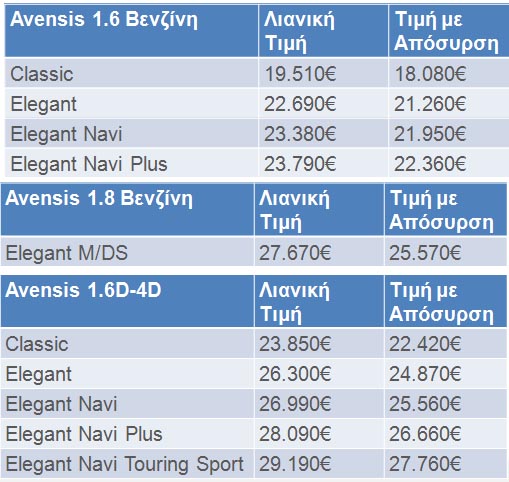 Οι τιμές του νέου Avensis διαμορφώνονται ως εξής: