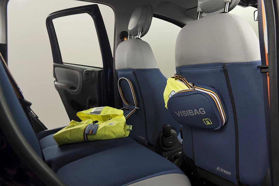 Στο εσωτερικό τα καθίσματά του είναι δίχρωμα σε μπλε/γκρι τόνους με οικολογικό δέρμα, συνδυασμός που ταιριάζει αρμονικά με το μπλε ταμπλό και τον ασημένιο πίνακα οργάνων. Τα χαρακτηριστικά λογότυπα της K-Way έχουν εμφανή παρουσία και στο εσωτερικό του μοντέλου, καθώς, πέρα από τα καθίσματα, υπάρχουν και στις ζώνες ασφαλείας αλλά και στα μπλε πατάκια. Επίσης, τα καθίσματα εμπρός είναι εξοπλισμένα με «VISIBAG», τα οποία είναι ειδικά γιλέκα ασφαλείας σχεδιασμένα από την K-Way για τη Fiat.