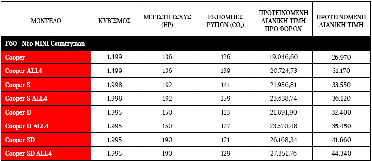 Πιο αναλυτικά, το νέο Countryman πωλείται σε τιμές που ξεκινούν από 26.970 ευρώ για την αρχική έκδοση Cooper με τον κινητήρα βενζίνης των 1.5 λτ. ισχύος 136 ίππων και από 32.400 ευρώ για το αρχικό ντίζελ Countryman Cooper D με το 2λιτρο μηχανικό σύνολο των 150 ίππων. Παράλληλα, υπάρχουν τετρακίνητες εκδόσεις ALL4 τόσο με τους κινητήρες βενζίνης όσο και πετρελαίου (από 31.170 ευρώ).