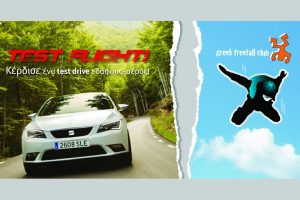 Η SEAT Τεχνοκάρ σε συνεργασία με το μεγαλύτερο κέντρο skydiving στην Ελλάδα, το Greek Freefall Club, διοργανώνει διαγωνισμό μέσω της σελίδας της SEAT Greece στο facebook για την ανάδειξη 1 νικητή, ο οποίος θα κερδίσει ένα αξέχαστο test drive εδάφους-αέρος!