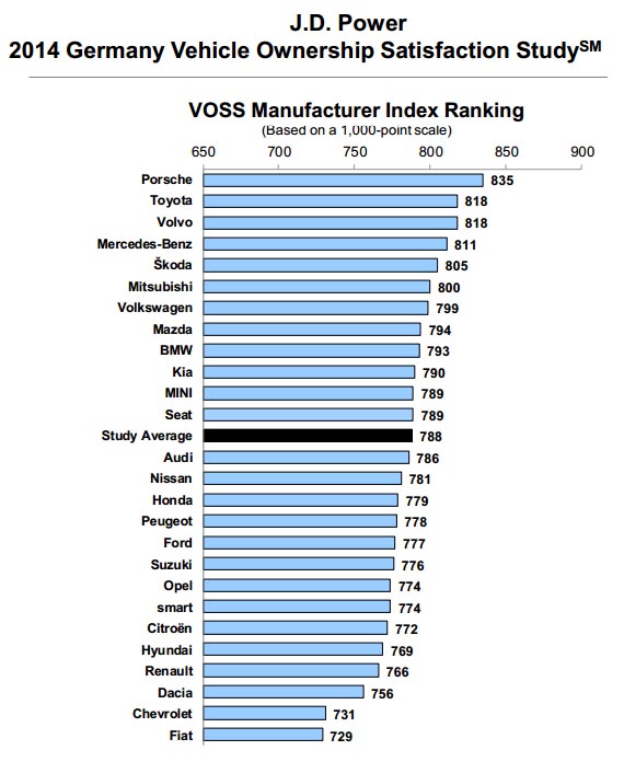Στην Έρευνα Ικανοποίησης Κατόχων που έκανε η J.D. Power για την αγορά της Γερμανίας, στις τρεις πρώτες θέσεις της κατάταξης ανά μάρκα βρέθηκαν οι Porsche, Toyota και Volvo, ωστόσο κάτω από το μέσο όρο τοποθετήθηκαν αρκετές Γερμανικές, Ιαπωνικές και Γαλλικές εταιρείες (βλ. αναλυτικούς πίνακες παρακάτω). Παράλληλα, στις δημοφιλέστερες κατηγορίες των μίνι, μικρών και μικρομεσαίων αυτοκινήτων τις πρώτες θέσεις κατέλαβαν τα μοντέλα Volkswagen up!, Toyota Yaris και SEAT Leon αντίστοιχα.