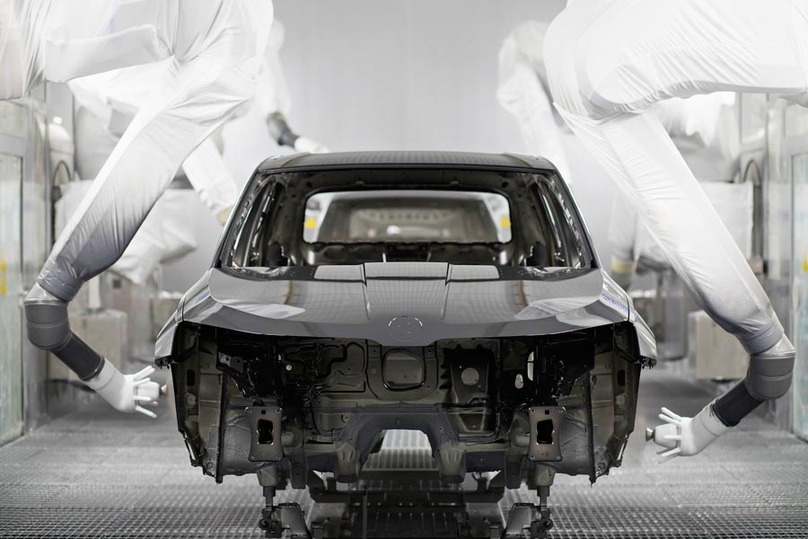 9. Μετά το φούρνο το αυτοκίνητο παραλαμβάνεται από το τμήμα λείανσης και διορθώνονται πιθανά ελαττώματα στη βαφή. Κύλινδροι με φτερά από στρουθοκάμηλο αφαιρούν τα μικρότερα σωματίδια βρωμιάς ή σκόνης. Στο τέλος ρομπότ αναλαμβάνουν τη βαφή μιας στρώσης ή δύο στρώσεων στα μεταλλικά χρώματα. Μετά από την παραμονή του αυτοκινήτου για 15 λεπτά σε φούρνο 85 βαθμών Κελσίου ακολουθεί το βερνίκι για να δώσει την τελική λάμψη και την προστασία από μικρογρατσουνιές. Στο τέλος οι εργαζόμενοι απομακρύνουν τυχόν ατέλειες και γυαλίζουν το αμάξωμα.