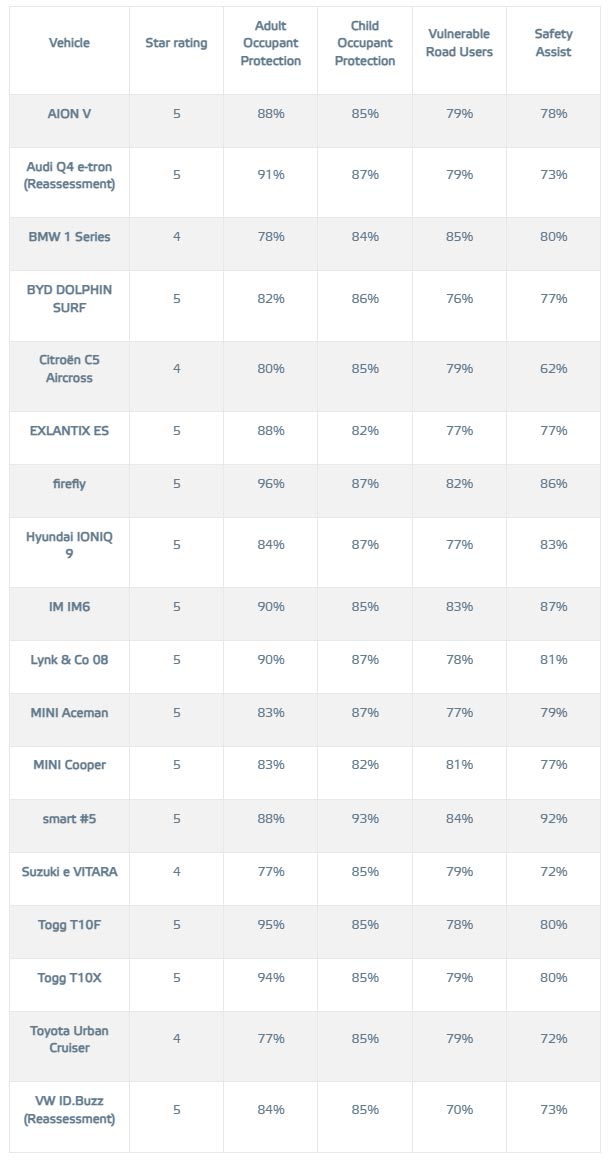 Τα Audi Q4 e-tron, Hyundai Ioniq 9, MINI Aceman και smart #5 είναι όλα SUV με βαθμολογία πέντε αστέρων. Οι πέντε Κινέζοι κατασκευαστές αυτοκινήτων που συμμετείχαν παρείχαν ένα ανταγωνιστικό επίπεδο ασφάλειας που σε γενικές γραμμές ήταν εφάμιλλο των Ευρωπαίων και Κορεατών ανταγωνιστών τους στον τομέα των ηλεκτρικών οχημάτων. Το Aion V, ένα SUV, το Exlantix ES, ένα οικογενειακό sedan, το IM IM6, ένα crossover, και το BYD Dolphin Surf, υπενθύμισαν περαιτέρω ότι η ταχέως αναπτυσσόμενη αυτοκινητοβιομηχανία της Κίνας είναι ικανή να κατασκευάζει αυτοκίνητα με παγκοσμίως συγκρίσιμα επίπεδα ασφάλειας. Ωστόσο, παρά την απονομή πέντε αστέρων, τόσο το Lynk & Co 08, όσο και το Volkswagen ID.Buzz, παραλίγο να χάσουν το πέμπτο αστέρι τους λόγω κακής προστασίας της λεκάνης για τους πεζούς.