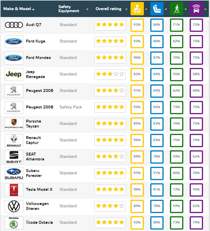 Συγκεκριμένα, τα μοντέλα Tesla Model X, Porsche Taycan, Audi Q7, Renault Captur, Subaru Forester, Skoda Octavia, Ford Mondeo και Ford Kuga έλαβαν 5 αστέρια, το Peugeot 2008 πήρε 4 αστέρια ή 5 με το προαιρετικό Safety Pack, τα αναβαθμισμένα δίδυμα VW Sharan και SEAT Alhambra πήραν 4 αστέρια και το Jeep Renegade έλαβε 3 αστέρια.