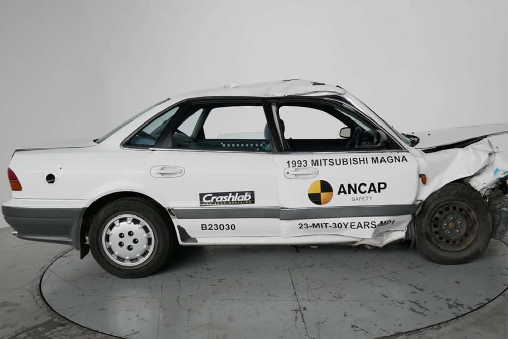 Ο Αυστραλιασιατικός NCAP (Australasian New Car Assessment Program) πήρε ένα Galant του ’93 και το έθεσε στη δοκιμασία της μετωπικής σύγκρουσης, με τα μετρητικά όργανα να χτυπάνε «κόκκινο» παντού. Παρόλο που οπτικά το αμάξωμα και το σασί του 30χρονου σεντάν δεν έχει γίνει «φυσαρμόνικα», η απουσία αερόσακων μεταφράζεται σε υψηλότατο κίνδυνο θανατηφόρων τραυματισμών για οδηγό-συνοδηγό, ή πρόκληση εγκεφαλικών βλαβών. Τα κεφάλια και των δυο ανδρείκελων χτύπησαν σε τιμόνι-ταμπλό αντίστοιχα, ενώ μεγάλα προβλήματα αντιμετώπισαν και τα πόδια. Τόσο η κολώνα του τιμονιού όσο και το ταμπλό μετατοπίσθηκαν έντονα, μεταφέροντας υψηλά φορτία στα πόδια των crash test dummies.