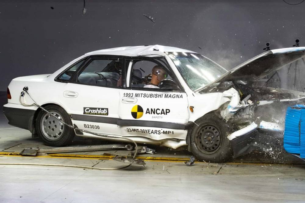 Ο Αυστραλιασιατικός NCAP (Australasian New Car Assessment Program) πήρε ένα Galant του ’93 και το έθεσε στη δοκιμασία της μετωπικής σύγκρουσης, με τα μετρητικά όργανα να χτυπάνε «κόκκινο» παντού. Παρόλο που οπτικά το αμάξωμα και το σασί του 30χρονου σεντάν δεν έχει γίνει «φυσαρμόνικα», η απουσία αερόσακων μεταφράζεται σε υψηλότατο κίνδυνο θανατηφόρων τραυματισμών για οδηγό-συνοδηγό, ή πρόκληση εγκεφαλικών βλαβών. Τα κεφάλια και των δυο ανδρείκελων χτύπησαν σε τιμόνι-ταμπλό αντίστοιχα, ενώ μεγάλα προβλήματα αντιμετώπισαν και τα πόδια. Τόσο η κολώνα του τιμονιού όσο και το ταμπλό μετατοπίσθηκαν έντονα, μεταφέροντας υψηλά φορτία στα πόδια των crash test dummies.