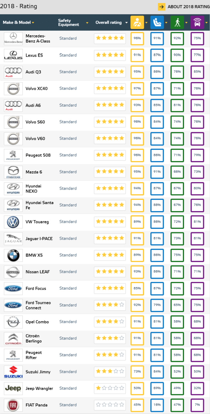 Αν και όπως είπαμε – και υπογραμμίζει ο ίδιος ο Euro NCAP – τα αυτοκίνητα βαθμολογούνται με κριτήρια διαστάσεων και εμπορικής τοποθέτησης, τα ποσοστά προστασίας μπορούν να αναγάγουν έναν νικητή στην γενική κατάταξη. Βάσει αυτών, η A-Class είναι το ασφαλέστερο αυτοκίνητο του 2018 καθώς «σκόραρε» πάνω από 90% σε 3 από τους 4 τομείς αξιολόγησης, ενώ το 96% που σημείωσε στην προστασία ενηλίκων είναι από τα μεγαλύτερα νούμερα που έχουν καταγραφεί στην βάση δεδομένων του Euro NCAP.