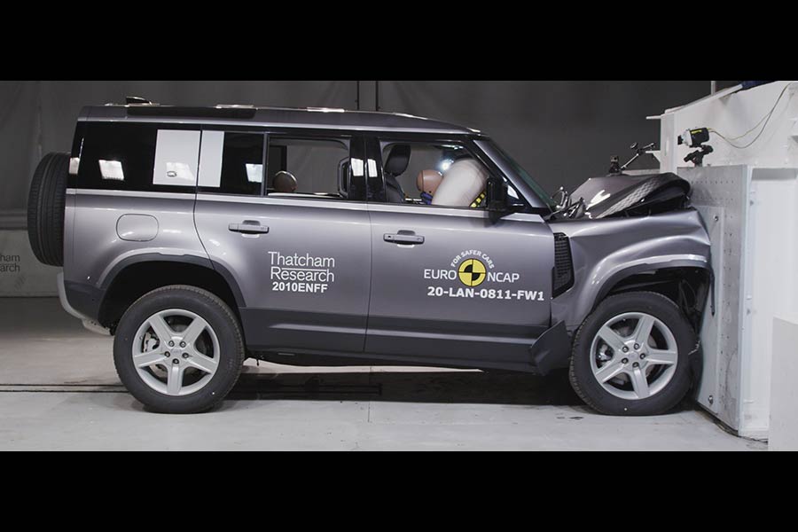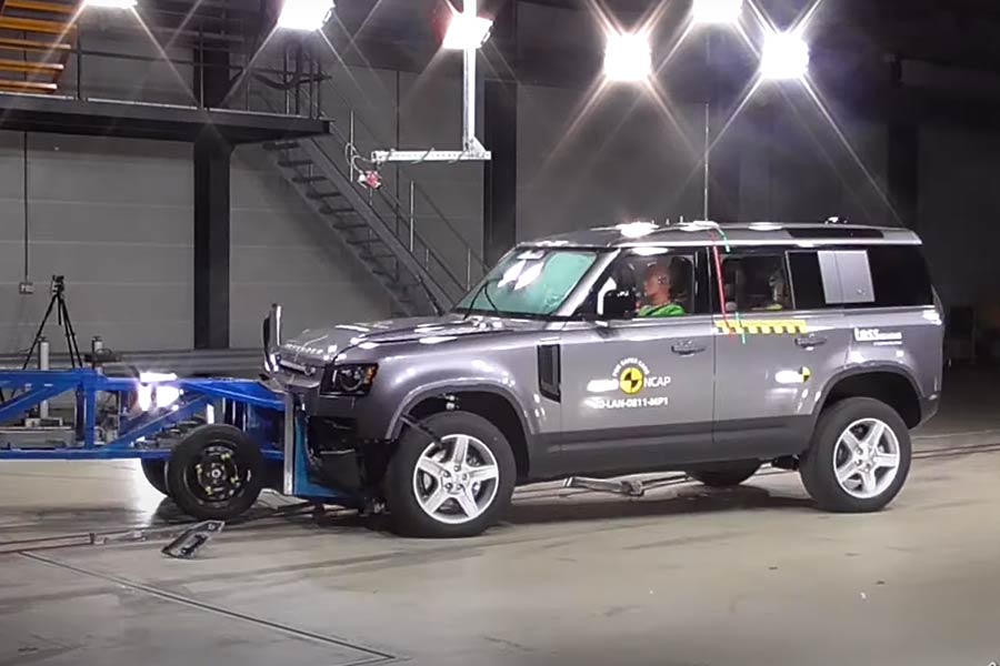 Περισσότερο εντύπωση όμως βλέποντας τα βίντεο με τα crash tests, προκαλεί το θεόρατο Defender. Το ογκώδες αμάξωμά του με μήκος 4,8 μ. και βάρους 2,3 τόνων εκτόπισε στην κυριολεξία την κινούμενη μπαριέρα προοδευτικής παραμόρφωσης (MPDB). Σε αυτό το νέο τεστ το αυτοκίνητο κινείται με 50 χλμ./ώρα και με το 50% της επιφάνειάς του προσκρούει στο 50% της επιφάνειας της παραμορφούμενης μπαριέρας. Αυτή βρίσκεται στο εμπρός τμήμα μιας κατασκευής βάρους 1.400 κιλών, η οποία συγκρούεται με το αυτοκίνητο με 50 χλμ./ώρα.