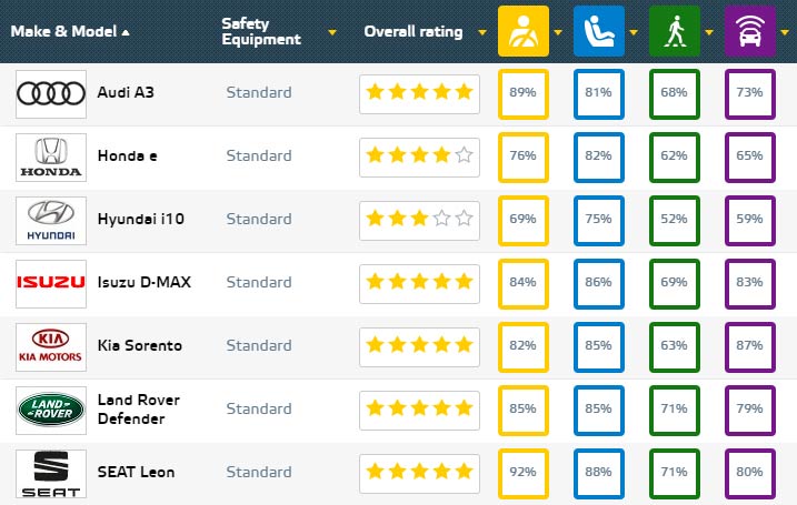 Ο ανεξάρτητος οργανισμός Euro NCAP ανακοίνωσε τα νέα αποτελέσματα των δοκιμών που έκανε σε επτά νέα μοντέλα, μεταξύ των οποίων υπήρξαν 5άστερα αλλά και λιγότερων αστέρων. Συγκεκριμένα τα 5 αστέρια έλαβαν το Audi A3, το SEAT Leon, το Isuzu D-MAX, το Kia Sorento και το Land Rover Defender. Με 4 αστέρια αξιολογήθηκε το Honda e και με 3 αστέρια το Hyundai i10.