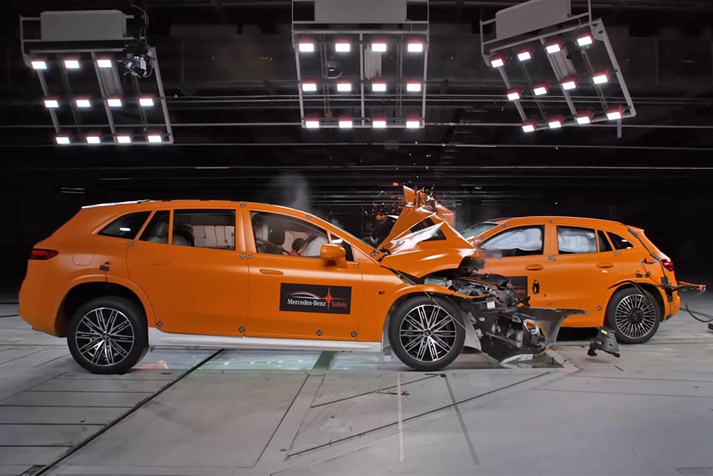 Η Mercedes-Benz χρησιμοποίησε δύο πραγματικά αυτοκίνητα, το μικρότερο ηλεκτρικό SUV μοντέλο της EQA βάρους 2,2 τόνων και το μεγαλύτερο, την EQS SUV των 3 τόνων! Επιπλέον ανέβασε την ταχύτητα πρόσκρουσης στα 56 χλμ./ώρα, που σημαίνει ότι η συνολική ενέργεια πρόσκρουσης ήταν σημαντικά υψηλότερη από τα τεστ του Euro NCAP. Οι ζημιές που υπέστησαν τα δύο SUV ήταν εκτεταμένη στο εμπρός τμήμα τους, όπως ο κλωβός ασφαλείας των επιβατών παρέμεινε ανέπαφος και οι πόρτες μπορούσαν να ανοίξουν. Σε μια αντίστοιχη πραγματική περίπτωση, οι επιβάτες θα έβγαιναν από τα οχήματά τους χωρίς βοήθεια ή σοβαρούς τραυματισμούς.