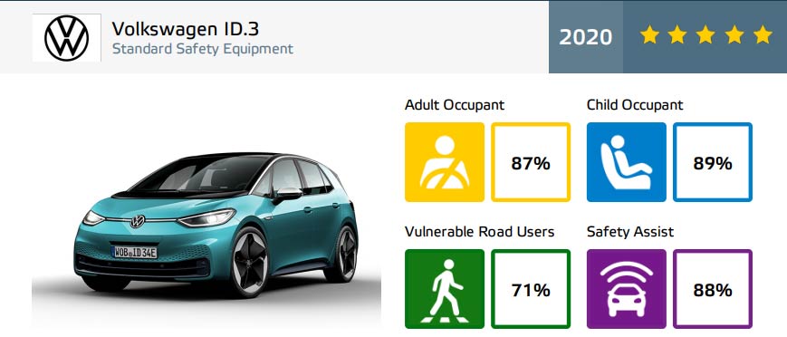 Το πρώτο εξολοκλήρου ηλεκτρικό αυτοκίνητο της VW, το ID.3 πέρασε με απόλυτη επιτυχία τις νέες και πιο σκληρές δοκιμές του Euro NCAP, λαμβάνοντας τη μέγιστη αξιολόγηση των 5 αστεριών. Τα ποσοστά ασφαλείας ανά τομέα έφτασαν το 87% για τους ενήλικους επιβάτες, 89% για τα παιδιά, 71% για τους πεζούς και 88% για τα επικουρικά συστήματα ασφαλείας.