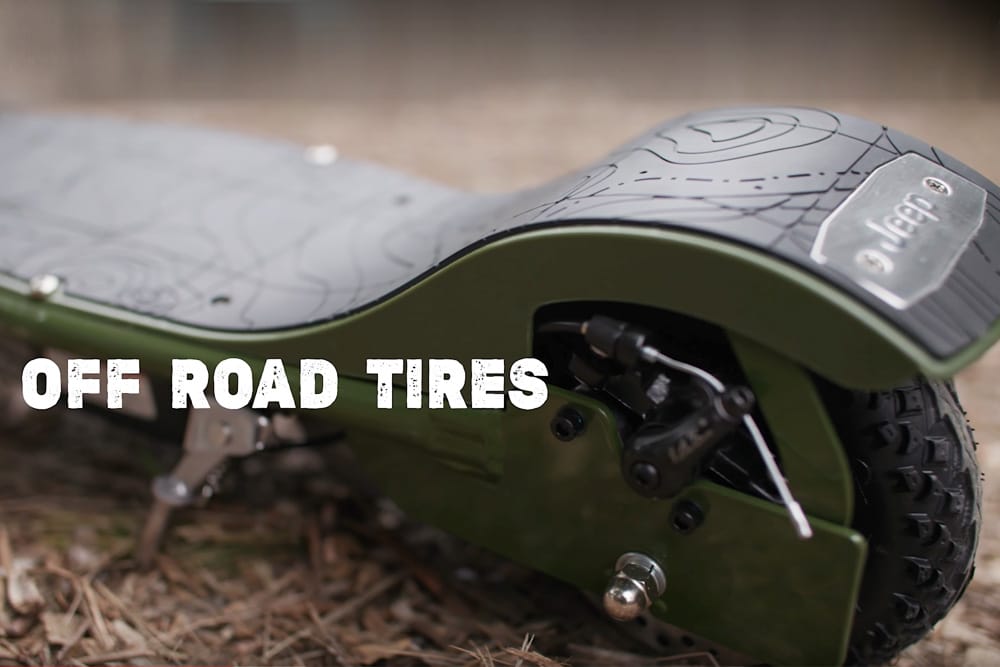 Η Jeep σε συνεργασία με την Razor, ανακοίνωσε το πρώτο της ηλεκτρικό πατίνι, φυσικά με εκτός δρόμου δυνατότητες, μένοντας πιστή στις αυθεντικές καταβολές της μάρκας. Το Jeep RX200 λοιπόν, όπως είναι η κωδική του ονομασία, διαθέτει «μπαμπάτσικα» ελαστικά 8 ιντσών με χαραγμένο πέλμα ειδικά για χρήση εκτός δρόμου. Το προφίλ τους είναι μεγάλο σε σχέση με τα ελαστικά δρόμου ακριβώς για να αποσβένουν τις ανωμαλίες στην off road χρήση, καθώς δεν υπάρχει ανάρτηση. Ο ηλεκτροκινητήρας με ισχύ 200W είναι ελαφρώς αδύναμος σε σχέση με τον ανταγωνισμό, αλλά όπως θα δείτε και στο βίντεο ανταπεξέρχεται ικανοποιητικά στις προκλήσεις των χωμάτινων διαδρομών. Το γκάζι είναι τύπου μηχανής με περιστροφικό μηχανισμό.