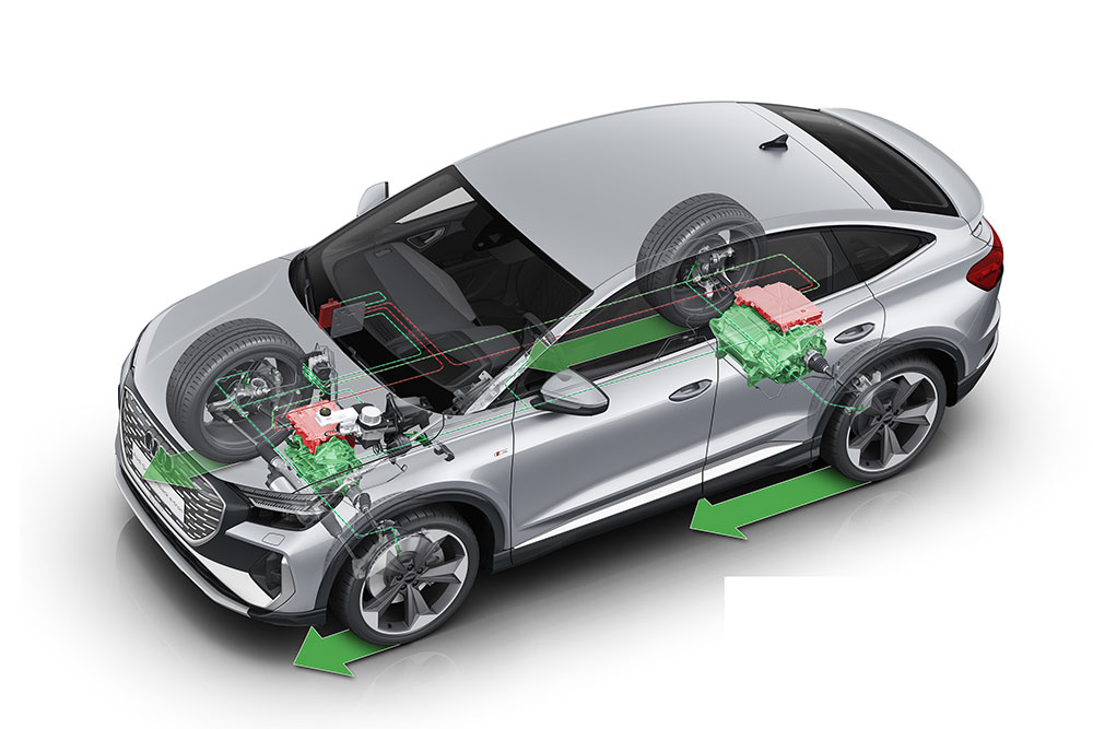 Πάμε τώρα στο ζουμί της υποθέσεως που αφορά τα ηλεκτρικά κινητήρια σύνολα των εντυπωσιακών Audi. Και για τους δύο τύπους αμαξωμάτων, η γερμανική μάρκα προσφέρει δύο εκδόσεις μπαταρίας και τρεις εκδόσεις ισχύος. Η μπαταρία με 9 κυψέλες για το Q4 35 e-tron έχει καθαρή ενεργειακή χωρητικότητα 52 kWh, ενώ η μεγαλύτερη μπαταρία στα Q4 40 e-tron και Q4 50 e-tron quattro έχει 12 κυψέλες και χωρητικότητα 77 kWh. Το Q4 35 e–tron και το Q4 40 e–tron έχουν έναν ηλεκτροκινητήρα που κινεί τους πίσω τροχούς, με ισχύ 170 ίππων και 204 ίππων αντίστοιχα. Η κορυφαία έκδοση Q4 50 e-tron quattro έχει δύο ηλεκτροκινητήρες για την ηλεκτρική τετρακίνηση quattro. Προσφέρουν μέγιστη ισχύ 299 ίππων, η οποία εξασφαλίζει επιτάχυνση 0-100 χλμ./ώρα σε 6,2 δευτερόλεπτα και ηλεκτρονικά περιορισμένη τελική ταχύτητα 180 χλμ./ώρα. Για μεγαλύτερο βαθμό ενεργειακής απόδοσης, ο κινητήρας στον μπροστινό άξονα ενεργοποιείται μόνο όταν απαιτείται υψηλή ισχύς ή ισχυρή πρόσφυση. Ένας άλλος σημαντικός παράγοντας στην εξοικονόμηση ενέργειας κατά την οδήγηση είναι η έξυπνη ανάκτηση, η οποία ενσωματώνει επίσης πλοήγηση και τοπογραφικά δεδομένα. Η προαιρετική αντλία θερμότητας χρησιμοποιεί την απορριπτόμενη θερμότητα από τις μονάδες υψηλής τάσης και τον αέρα περιβάλλοντος για τον έλεγχο του κλίματος στο εσωτερικό. Αυτό συμβάλλει στην αύξηση του βαθμού ενεργειακής απόδοσης, ειδικά σε μεγαλύτερες διαδρομές. Σε ότι αφορά την αυτονομία τώρα, αυτή μπορεί να αγγίξει τα 520 χλμ. κατά WLTP.