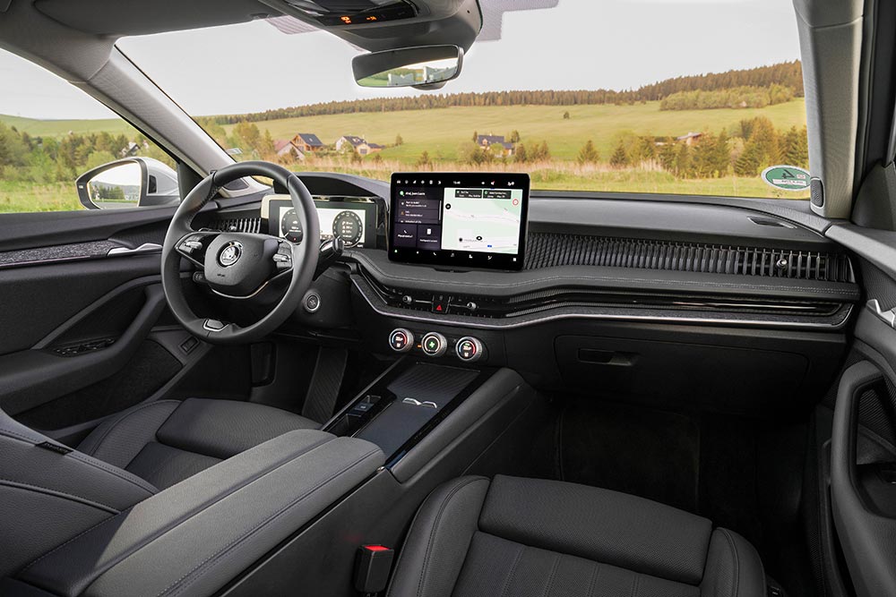 Στο εσωτερικό του νέου Skoda Superb η τεχνολογία με την πολυτέλεια συνδυάζονται αρμονικά. Διαθέτει μια μεγάλη κεντρική οθόνη 13 ιντσών και τα τρία νέα περιστροφικά χειριστήρια Smart Dials που βρίσκονται κάτω από την οθόνη του infotainment, με το καθένα να ενσωματώνει ψηφιακή οθόνη διαμέτρου 32 χιλιοστών. Η αύξηση του μήκους και ύψους εξασφάλισε ακόμα πιο τεράστιους χώρους για τους επιβάτες και τις αποσκευές, φτάνοντας το νούμερο των 690 λίτρων!