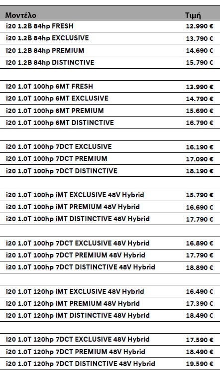 Η Hyundai ανακοίνωσε για την ελληνική αγορά τις τιμές, διαθέσιμες εκδόσεις και κινητήρες του εντελώς νέου Hyundai i20, το οποίο ξεκινάει από τα 12.990 ευρώ, με 4 επίπεδα εξοπλισμού και με 7 συνδυασμούς κινητήρων – κιβωτίων ταχυτήτων.