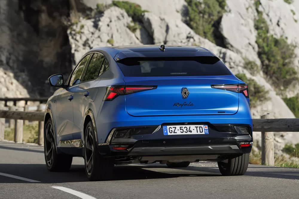 Η κορυφαία έκδοση του Rafale ενσωματώνει συνολικά 4 κινητήρες (1 βενζίνης + 3 ηλεκτρικούς), για μια συνδυαστική απόδοση 300 ίππων και ηλεκτρική αυτονομία που φτάνει ως τα 105 χλμ., την ώρα που η συνολική (με το ντεπόζιτο των 55 λίτρων γεμάτο) δύναται να φτάσει στα 1.000 χλμ. Θερμικός κινητήρας είναι ο τρικύλινδρος 1.2 τούρμπο με ανεβασμένη ισχύ στα 150 άλογα και τα 230 Nm (έναντι 130 ίππων και 205 Nm στο E-Tech 200). Το ηλεκτρικό τώρα, παρουσιάζει τριπλή εκπροσώπηση: ένα μοτέρ 68 ίππων και 205 Nm στον εμπρός άξονα, ένα 136 ίππων και 200 Nm στον πίσω, ενώ ακόμα ένα 34 ίππων και 50 Nm έχει το ρόλο γεννήτριας (HSG/High-voltage Starter Generator), αντλώντας όλα τους ενέργεια από μια μπαταρία ενεργειακής χωρητικότητας 22 kWh. Επίσης, η μετάδοση γίνεται με ένα αυτόματο κιβώτιο multimode 15 σχέσεων.