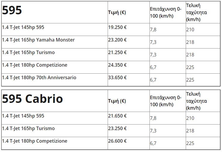 Εξαίρεση αποτελούν τα μίνι πυραυλάκια της Abarth και συγκεκριμένα η νέα σειρά 595, η οποία είναι διαθέσιμη και στην Ελλάδα. Εφοδιασμένα με τον κινητήρα 1.4 Τ-Jet που τοποθετείται και στα μονοθέσια των πρωταθλημάτων της Formula 4 σε Ιταλία και Γερμανία, η σειρά 595 διαθέτει –ανάλογα με την έκδοση- ιπποδυνάμεις που ξεκινούν από τους 145 και φτάνουν έως και τους 180 ίππους. Δίπλα στις συλλεκτικές σειρές Yamaha Monster και 70ο Anniversario, οι αναβαθμισμένες εκδόσεις Turismo και Competizione φέρνουν εκτός των άλλων και μερικές νοσταλγικές εκπλήξεις από την πλούσια κληρονομιά της μάρκας.