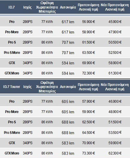 Μέχρι τώρα, το ID.7 ήταν διαθέσιμο αποκλειστικά στην έκδοση Pro (77 kWh). Πλέον, το μοντέλο είναι διαθέσιμο και στην κορυφαία έκδοση ID.7 Pro S με μπαταρία ενεργειακής χωρητικότητας 86 kWh. Τα βασικά στοιχεία επιδόσεων του είναι: ισχύς 286 PS, ροπή 545 Nm και επιτάχυνση από 0 έως 100 χλμ./ώρα σε 6,6 δλ. Με αυτονομία που αγγίζει τα 707 χλμ., το ID.7 Pro S αναδεικνύει την καταλληλότητά του για ταξίδια μεγάλων αποστάσεων. Επίσης φτάνει τη μέγιστη ισχύ φόρτισης των 200 kW, πράγμα που σημαίνει ότι μπορεί να φορτίσει σε λιγότερο από 26 λεπτά (10%-80%). Τόσο το ID.7 Tourer, όσο και το ID.7 είναι διαθέσιμα από σήμερα στις εκδόσεις Pro, Pro S, GTX καθώς και στις ειδικά αναβαθμισμένες εκδόσεις εξοπλισμού More που έχουν ως βάση τις βασικές εκδόσεις. Στις εκδόσεις More για το Pro & το Pro S, η αξία του επιπρόσθετου εξοπλισμού σε σύγκριση με τις βασικές εκδόσεις ορίζεται στις 9.800 ευρώ, με όφελος πελάτη 7.800 ευρώ.
