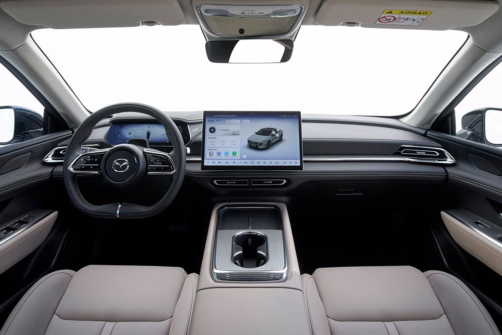 Εξίσου εντυπωσιακό είναι το πολυτελές και υψηλής τεχνολογίας εσωτερικό του νέου Mazda6e με τον πολύ αρμονικό σχεδιασμό. Στο κέντρο του ταμπλό κυριαρχεί η μεγάλη οθόνη αφής των 14,6 ιντσών του συστήματος πολυμέσων, ενώ μπροστά από τον οδηγό είναι τοποθετημένο ένα ψηφιακό καντράν 10,2 ιντσών. Η προσοχή στην πολυτέλεια και στη λεπτομέρεια είναι έκδηλη σε κάθε σπιθαμή της καμπίνας, χωρίς όμως να δημιουργούν μια «βαριά» ατμόσφαιρα. Οι χώροι για τους επιβάτες είναι αναμενόμενα άνετοι, ενώ το πορτ μπαγκάζ έχει μεγάλο άνοιγμα λόγω της 5ης πόρτας που ανοίγει μαζί με το παρμπρίζ. Ο χώρος αποσκευών με το τετραγωνισμένο σχήμα έχει χωρητικότητα 466 λίτρα (μαζί με το αποθηκευτικό τμήμα κάτω από το δάπεδο), ενώ το frunk χωράει άλλα 72 λίτρα. Ο στάνταρ εξοπλισμός είναι πλουσιότατος σε όλους τους τομείς, περιλαμβάνοντας μεταξύ άλλων 9 αερόσακους, πληθώρα συστημάτων ADAS, ζάντες 19 ιντσών, ηλεκτρικό κάθισμα οδηγού, ηλεκτρικά ανοιγόμενη θύρα πορτ μπαγκάζ, σύστημα παρακολούθησης 360 μοιρών, θερμαινόμενα και αεριζόμενα καθίσματα, θερμαινόμενο τιμόνι, Head-Up-Display και άλλα πολλά. Επίσης, ισχύει εγγύηση 6 ετών ή 150.000 χλμ., συν 8ετής εγγύηση για την μπαταρία υψηλής τάσης.