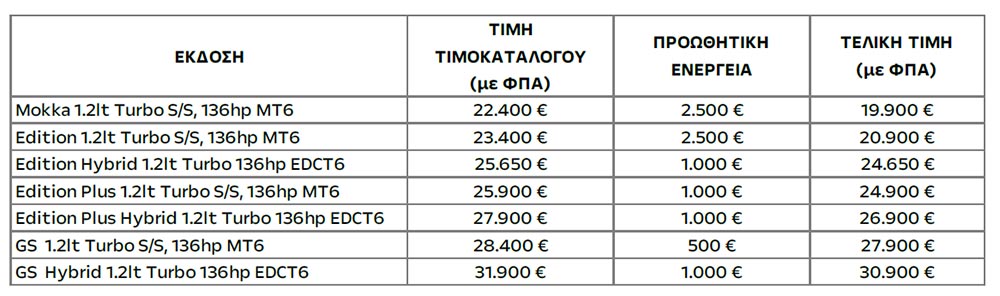 Η Opel στην Ελλάδα ανακοίνωσε την τιμή, εκδόσεις και λοιπά χαρακτηριστικά του ανανεωμένου Mokka, το οποίο εκκινεί από μόνο 19.900 ευρώ (με την προωθητική ενέργεια) και μάλιστα με το δυνατό 1.200άρη turbo κινητήρα των 136 ίππων. Το εκσυγχρονισμένο μικρό SUV της Opel προσφέρει ακόμα περισσότερη τεχνολογία, σε συνδυασμό με σπορ εμφάνιση και πλουσιότερο εξοπλισμό.
