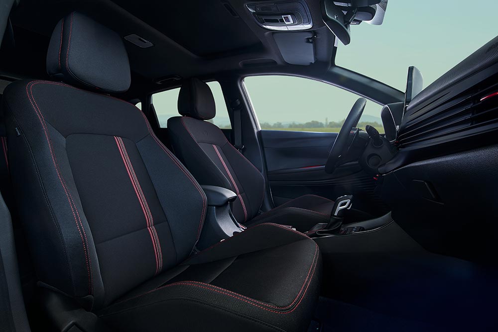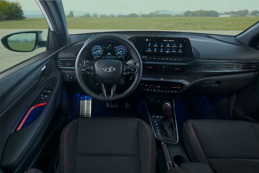 Περνώντας στο εσωτερικό του νέου Hyundai i20 N Line, τη διαφορά κάνουν αμέσως τα καθίσματα με την ενισχυμένη πλευρική στήριξη, το σπορ τιμόνι, οι κόκκινες ραφές και τα αντίστοιχης απόχρωσης διακοσμητικά, ο ειδικά σχεδιασμένος δερμάτινος επιλογέας ταχυτήτων, το δερμάτινο χειρόφρενο και τα μεταλλικά πεντάλ.
