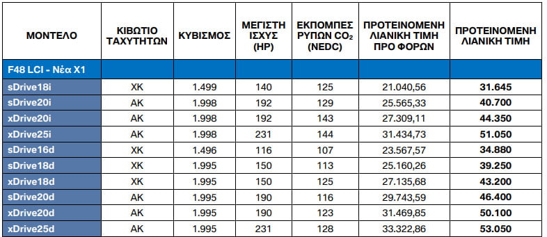 Η BMW Hellas ανακοίνωσε το νέο της τιμοκατάλογο, στον οποίο περιλαμβάνονται και οι τιμές της ανανεωμένης BMW X1. Αυτές ξεκινούν από τα 31.645 ευρώ στην έκδοση sDrive18i με τον 1.5 λτ. κινητήρα βενζίνης των 140 ίππων και από 34.880 ευρώ στην έκδοση sDrive16d με τον ντίζελ των 1.5 λτ. ισχύος 116 ίππων. Σε όλα τα υπόλοιπα μοντέλα οι κινητήρες βενζίνης και πετρελαίου είναι 2.0 λτ. και με απόδοση που φτάνει έως τους 231 ίππους (δείτε παρακάτω τον τιμοκατάλογο).