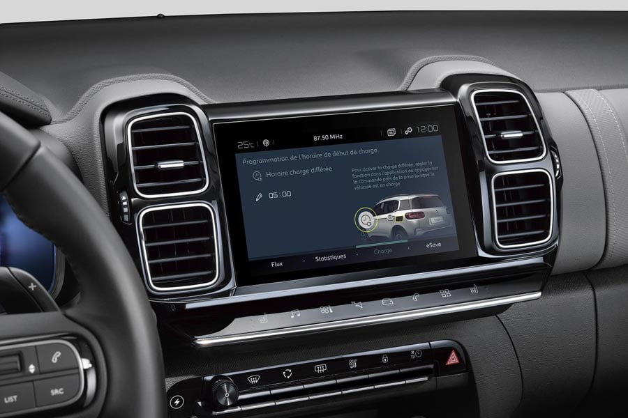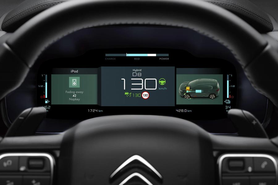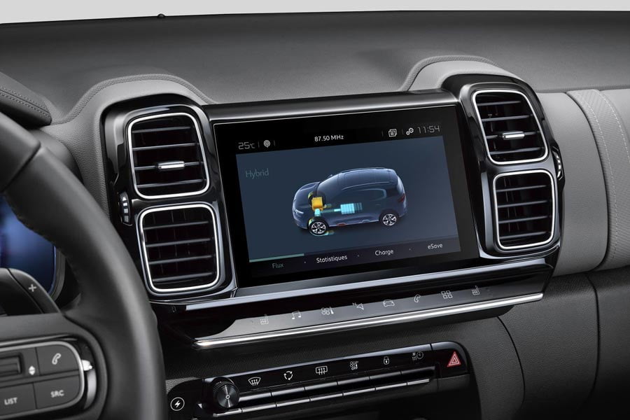 Στο θάλαμο των επιβατών του C5 Aircross Hybrid ξεχωρίζουν οι νέες ενδείξεις στον πίνακα οργάνων και στην οθόνη του συστήματος πολυμέσων. Τα τρία πίσω συρόμενα και αναδιπλούμενα καθίσματα διατηρήθηκαν, προς όφελος της πρακτικότητας. Η χωρητικότητα του πορτ μπαγκάζ είναι από 460 έως 600 λτ. (580-720 λτ. το αμιγώς βενζίνης).