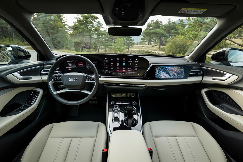 Στο εσωτερικό του νέου Audi A5 κυριαρχεί η ψηφιακότητα στο ταμπλό. Η λεπτή πανοραμική οθόνη Audi MMI με κυρτή σχεδίαση είναι τεχνολογίας OLED. Αποτελείται από το Audi virtual cockpit με οθόνη 11,9 ιντσών και την οθόνη αφής MMI 14,5 ιντσών. Η Audi ολοκληρώνει την ψηφιακή εμπειρία για τους μπροστινούς επιβάτες με την προαιρετικά διαθέσιμη οθόνη συνοδηγού MMI 10,9 ιντσών, η οποία είναι ενσωματωμένη στη σχεδίαση του ταμπλό. Η πολυτέλεια είναι δεδομένη, όπως και η ευρυχωρία που απολαμβάνουν οι επιβάτες. Ωστόσο, παρά τα 4,8+ μέτρα μήκους, το πορτ μπαγκάζ είναι αναλογικά λίγο με τα 417-445 λίτρα (448-476 λτ. το Avant).