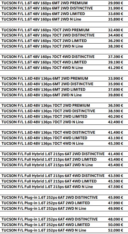 Το νέο Tucson εκκινεί από τις 29.990 ευρώ στην έκδοση Premium, με τον 1.6Τ 48V των 160 ίππων κάτω από το καπό και 6άρι χειροκίνητο κιβώτιο, να περνούν την κίνηση στον εμπρός άξονα. Το τετρακίνητο συνδυάζεται αποκλειστικά με το 7άρι αυτόματο διπλού συμπλέκτη, ξεκινώντας από την έκδοση Distinctive και τις 37.390 ευρώ, ενώ όσοι θέλουν το 2WD με το 7άρι DCT θα χρειαστούν 32.490 ευρώ (στην έκδοση Premium). Από εκεί και πέρα οι τιμές φτάνουν μέχρι τις 41.290 ευρώ, για το κορυφαίο mild hybrid βενζινοκίνητο 4WD N Line, την ώρα που τον ντίζελ 1.6D 48V ξεκινά από τις 33.990 και φτάνει μέχρι τις 45.390 ευρώ. Το full hybrid των 215 ίππων κυμαίνεται μεταξύ 41.490 και 47.590 ευρώ, ενώ το PHEV -που προσφέρεται για πρώτη φορά και ως δικίνητο- των 252 ίππων μεταξύ 45.090 και 52.090 ευρώ.