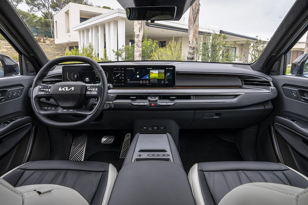 Το EV9 φτάνει τα 5.010 χλστ. σε μήκος, τα 1.980 χλστ. σε πλάτος, τα 1.750 χλστ. σε ύψος και τα 3.010 χλστ. σε μεταξόνιο. Διαστάσεις που εξασφαλίζουν τεράστιους χώρους στο εσωτερικό, είτε στην 6θέσια διάταξη, είτε στην 7θέσια. Αναλόγως XXL και το πορτμπαγκάζ, με 828 λίτρα στην 5θεσια και 333 λίτρα στην 7θεσια διάταξη, συν 90 λίτρα στο frunk (52 στις τετρακίνητες εκδόσεις). Το κορυφαίο ηλεκτρικό Kia ξεχωρίζει και για την υψηλή τεχνολογία στο εσωτερικό του, όπου στο μινιμάλ ταμπλό με τις «καθαρές» γραμμές, κυρίαρχο στοιχείο αποτελεί μια ενιαία διάταξη δύο οθονών 12,3 ιντσών, μια για τον πίνακα οργάνων και μια για το infotainment, συν μία 5,3 ιντσών για τον έλεγχο του κλιματισμού. Επιπλέον εφοδιάζεται με head-up display 5 ιντσών και οθόνες στις άκρες του ταμπλό για τις κάμερες – καθρέπτες.