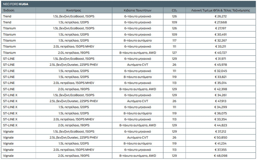 Ο μοναδικός διαθέσιμος κινητήρας αμιγώς βενζίνης είναι οι 1.5 λτ. EcoBoost 150 PS, με τιμή εκκίνησης τα 26.272 ευρώ. Το Kuga PHEV με το 2.5 λτ. κινητήρα βενζίνης Duratec και τη συνδυαστική ισχύ των 225 ίππων κοστίζει από 45.978 ευρώ. Στους ντίζελ, υπάρχουν οι επιλογές του 1.5 λτ. EcoBlue των 120 ίππων (από 27.668 ευρώ), ο 2.0 λτ. EcoBlue MHEV 150 PS (από 33.211 ευρώ) και ο 2.0 λτ. EcoBlue 190 PS (από 40.727 ευρώ).