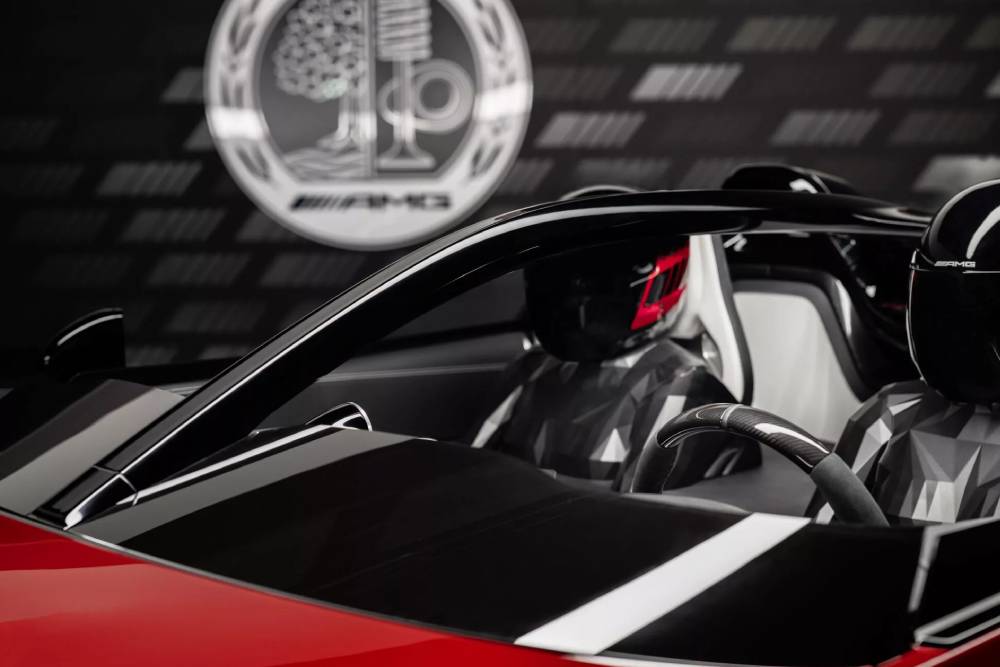 Εν όψει του Grand Prix το προσεχές Σαββατοκύριακο, οι Γερμανοί παρουσίασαν μια κατασκευή που επαναφέρει εικόνες από την 300 SLR Stirling Moss. Παρμπρίζ πλέον δεν υφίσταται, ούτε οροφή, ούτε πλαϊνά παράθυρα/κολώνες. Τη θέση τους έχει πάρει ένα ειδικά διαμορφωμένο halo, σαν αυτό που φέρουν τα μονοθέσια της F1. Το ντεγραντέ χρώμα, που περνάει από βυσσινί σε μαύρο, αντλεί έμπνευση από το One, ενώ από το hypercar της Mercedes-AMG είναι παρμένος και ο προφυλακτήρας. Οι αεροδυναμικές προσθήκες περιμετρικά του αμαξώματος έχουν εξελιχθεί σε σήραγγα, όπως και το περίτεχνο σχέδιο των ανθρακονημάτινων ζαντών. Και κάπου εδώ, τελειώνει η πληροφόρηση από τους Γερμανούς.