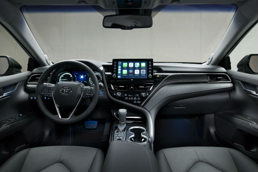 Εντός του φρεσκαρισμένου Camry συναντάμε νέα οθόνη αφής 9 ιντσών, που βρίσκεται πιο ψηλά στο ταμπλό και διαθέτει κουμπιά, βελτιώνοντας την εργονομία και την ευχρηστία. Οι Ιάπωνες αναφέρουν επίσης ταχύτερο λογισμικό και καλύτερη απόκριση της οθόνης στο άγγιγμα, ενώ οι λειτουργίες Apple CarPlay και Android Auto ανήκουν στο στάνταρ εξοπλισμό. Στον προαιρετικό, υπάρχουν δυο νέες δερμάτινες επενδύσεις σε μπεζ ή μαύρο, όπως και επενδύσεις Black Engineered Wood και Titanium Line (απομίμηση ξύλου και τιτανίου αντίστοιχα) για το ταμπλό.