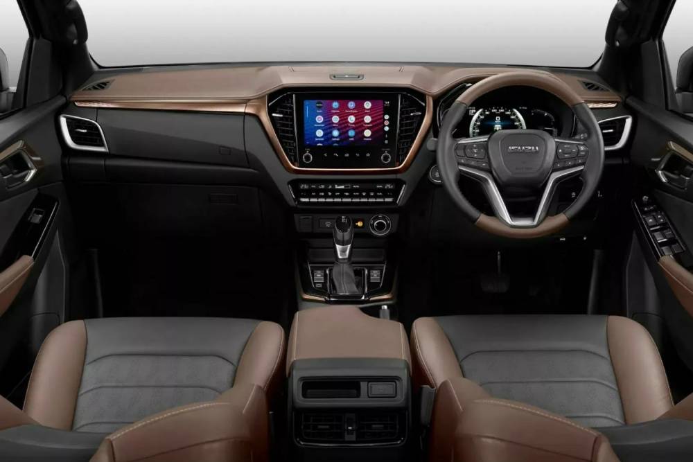 Στο εσωτερικό, το ταμπλό διατηρεί την αισθητική του απερχόμενου μοντέλου, αλλά ντύνεται με ποιοτικότερα υλικά και περισσότερη τεχνολογία. Η οθόνη αφής των 9 ιντσών διαθέτει και φυσικά κουμπιά, προς βελτίωση της εργονομίας, ενώ το ψηφιακό καντράν των 7 ιντσών χαρακτηρίζεται από τη μεγαλύτερη ευκρίνεια, τα καλύτερα γραφικά και την εκτενέστερη απεικόνιση πληροφοριών. Η Isuzu πρόσθεσε θύρες USB-C για τους εμπρός και τους πίσω επιβάτες, όπως και ένα νέο κλειδί με λειτουργία απομακρυσμένης εκκίνησης κινητήρα, θερμαινόμενη κάμερα για τη λειτουργία των επικουρικών συστημάτων και ενεργό cruise control.