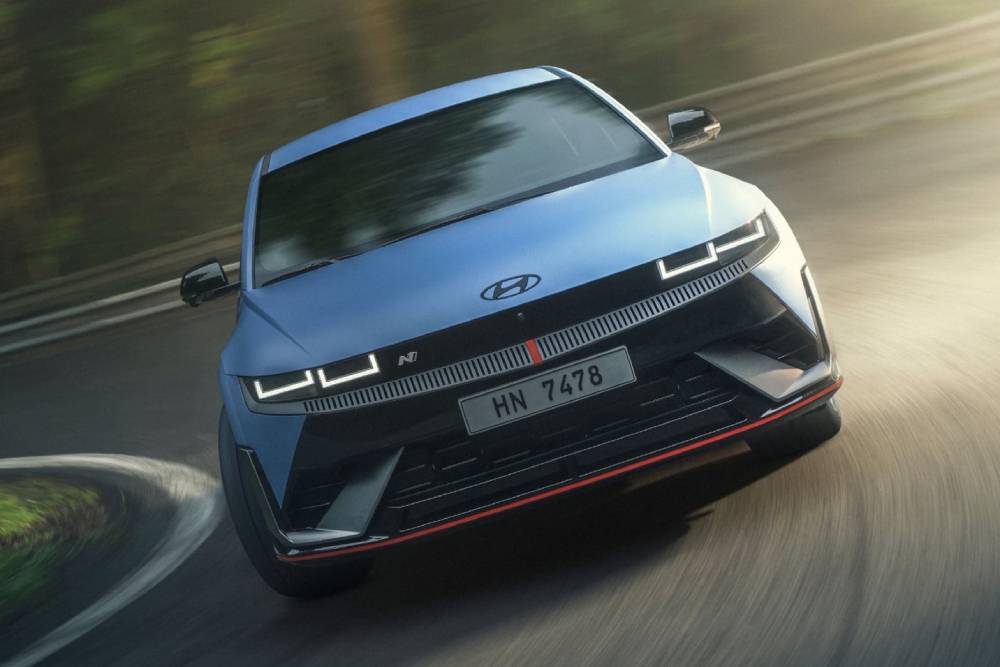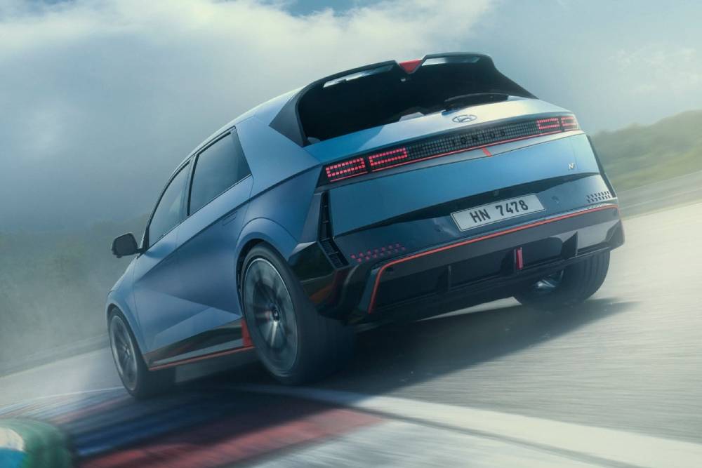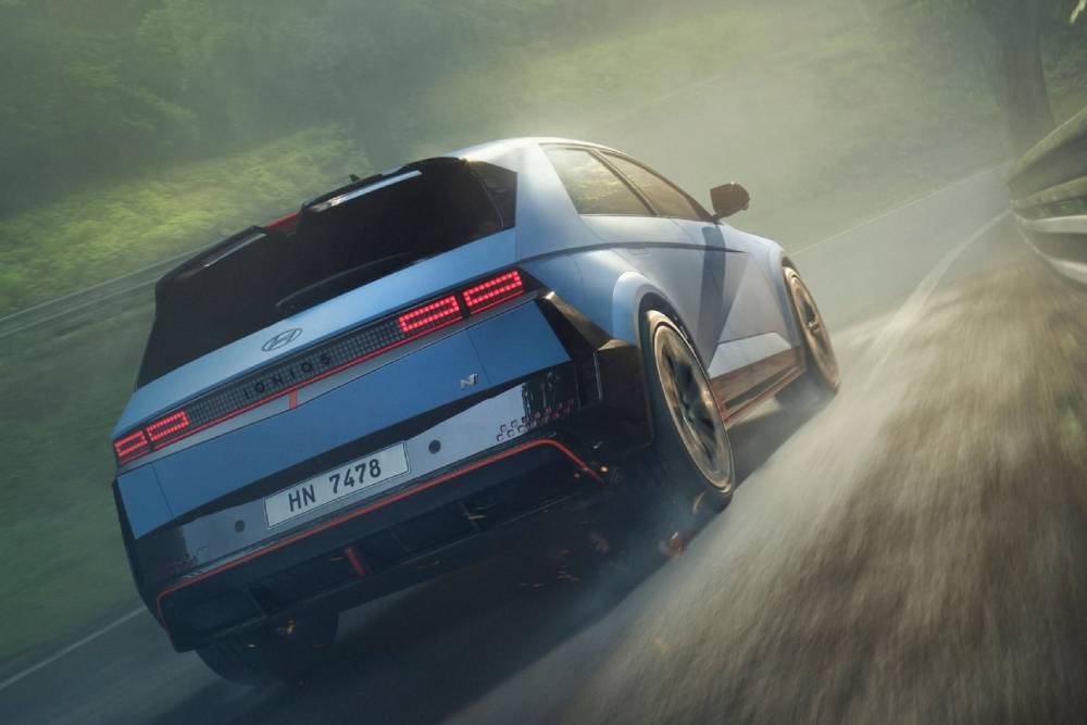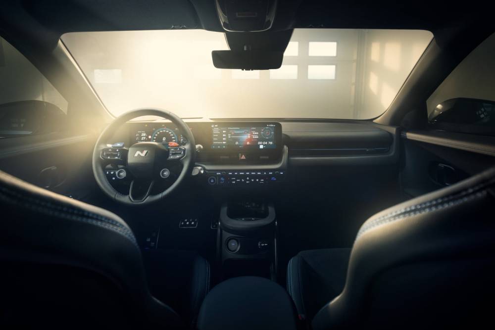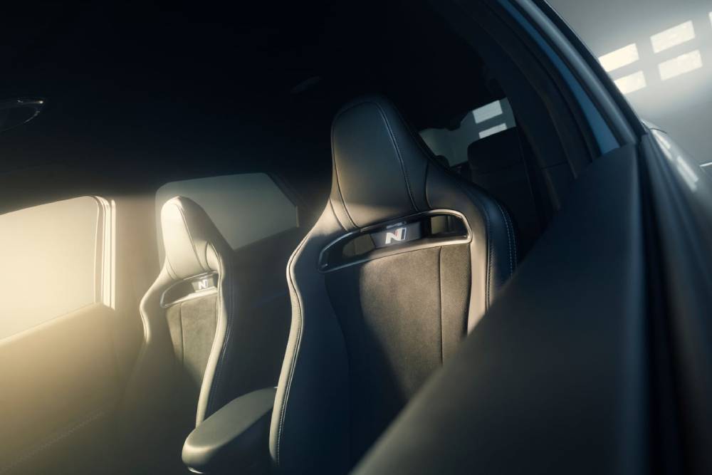 Πριν μπούμε στο πολύ «ψητό», πολλές ματιές στο παρουσιαστικό του κορυφαίου N. To Performance Blue δεν θα μπορούσε να λείπει από το φουσκωμένο αμάξωμα, ούτε οι κόκκινες λεπτομέρειες στα gloss black αεροδυναμικά βοηθήματα (splitter μπροστά, ποδιές στο πλάι, διαχύτης πίσω). Ο εμπρός προφυλακτήρας φιλοξενεί και μια μεμβράνη που μιμείται το ανθρακονημάτινο look, μαζί με μια κόκκινη λωρίδα στο κέντρο του. Οι αεραγωγοί στα πίσω φτερά συνιστούν πρωτιά για Hyundai N, όπως και οι ζάντες διαμέτρου 21 ιντσών (σε λάστιχα 275/35). Στο κέντρο του διαχύτη τραβάει τα βλέμματα το κάθετο φως ομίχλης, ενώ στην κορυφή του πίσω μέρος βλέπουμε το τριγωνικό τρίτο «στοπ» ανάμεσα στα δυο σκέλη της αεροτομής.