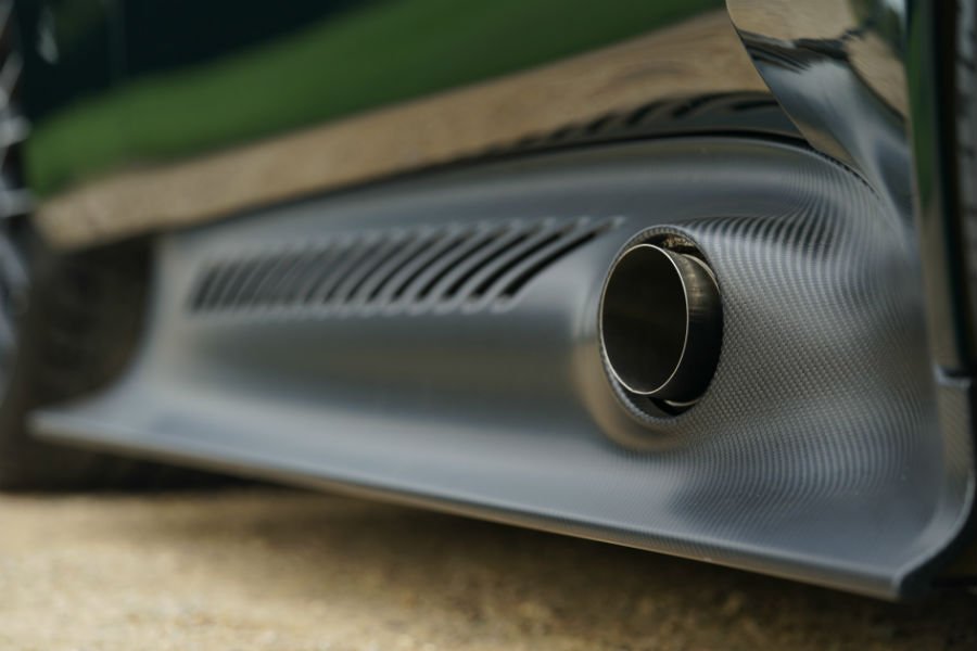 To αμάξωμα είναι βαμμένο στο παραδοσιακό Pentland Green χρώμα και αποτελείται από ανθρακονήματα. Οι αεροδυναμικές επιταγές καλύπτονται με το splitter εμπρός, τα side ports -παρμένα κατευθείαν από την Vulcan- και τον διαχύτη πίσω, που προσφέρουν 842 Nm κάθετης δύναμης στα 160 χλμ./ώρα. Συγκριτικά, η αγωνιστική Vantage GT4 παράγει μόλις 542 Nm downforce στην ίδια ταχύτητα.