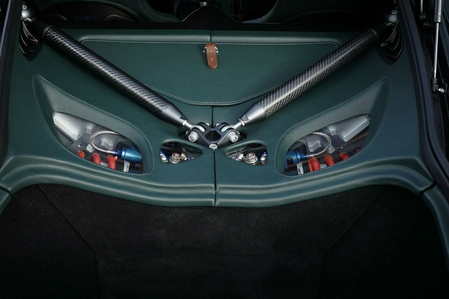 Στο εσωτερικό, πέρα από τον χορταστικό λεβιέ, τις εντυπώσεις κερδίζουν οι δυο οθόνες και φυσικά το κομμένο τιμόνι, που συνδέεται νοητά με τα αγωνιστικά πρωτότυπα. Εξυπακούεται ότι δέρμα και ανθρακόνημα υπάρχουν παντού.
