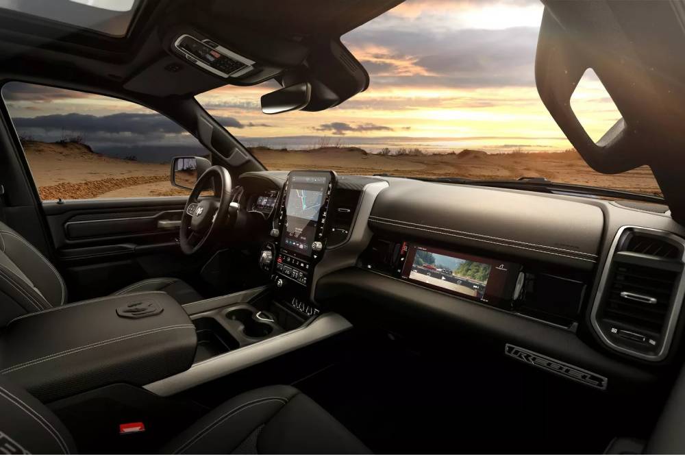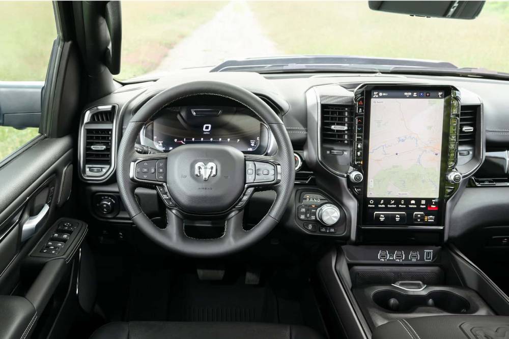 Περνώντας στο εσωτερικό, η αναβάθμιση σε αφήνει σοκαρισμένο. Αναβαθμισμένα υλικά και οθόνες παντού, ξεκινώντας από τον ψηφιακό πίνακα οργάνων (12,3 ιντσών), συνεχίζοντας στην πρωταγωνίστρια οθόνη αφής του infotainmet στο κέντρο του ταμπλό (14,5 ιντσών) και καταλήγοντας στη μακρόστενη των 10,25 ιντσών, που έχει ο συνοδηγός μπροστά του! Αναλόγως έκδοσης ο εξοπλισμός περιλαμβάνει από δερμάτινα καθίσματα και τετραζωνικό κλιματισμό, μέχρι ηχοσύστημα 23 ηχείων και καθίσματα με λειτουργία μασάζ. Από συστήματα ασφαλείας και συνδεσιμότητας ούτε λόγος, καθώς το νέο 1500 υποστηρίζει μέχρι Επιπέδου 2 αυτόνομη οδήγηση.
