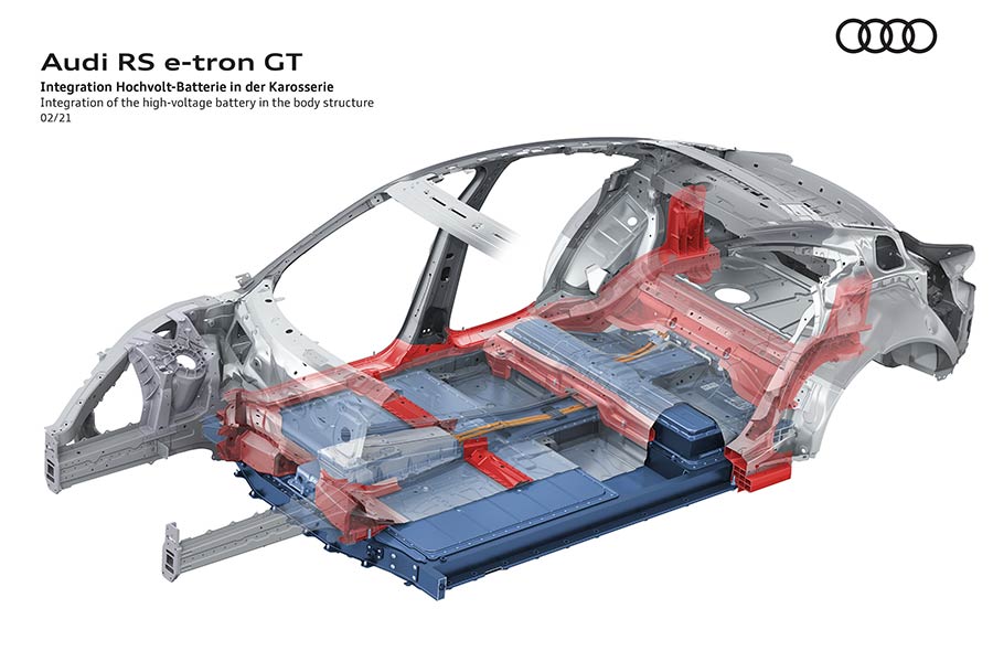 Η μπαταρία ιόντων λιθίου των Audi e-tron GT και RS e-tron GT είναι τοποθετημένη ανάμεσα στους άξονες, στο χαμηλότερο τμήμα του αυτοκινήτου για καλύτερο κέντρο βάρους και ιδανικό ζύγισμα 50:50. Η υψηλής απόδοσης μπαταρία μπορεί να αποθηκεύει ενέργεια 86 kWh (93 kWh μεικτή) σε αμφότερα τα μοντέλα. Η μεικτή κατανάλωση (NEDC) είναι 19,6 – 18,8 kW ανά 100 χλμ. στο Audi e-tron GT quattro και 20,2 – 19,3 kWh στο RS. Η αυτονομία φτάνει έως τα 487 χλμ. με NEDC ή 472 χλμ. με κύκλο WLTP.